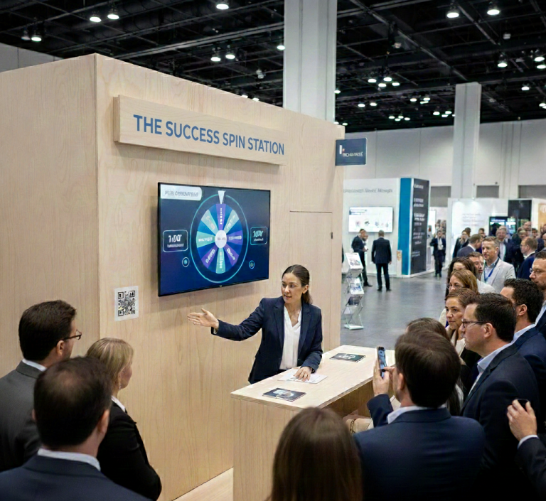 Attract foot traffic instantly with a fun, high-energy spin wheel. Perfect for giveaways, product reveals, and driving quick interactions at your booth.